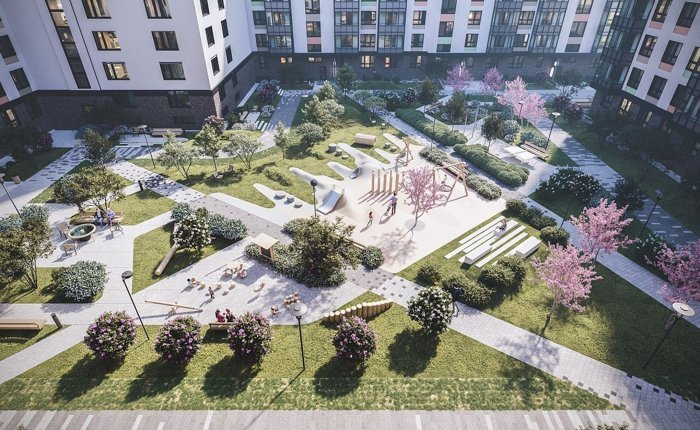 Для взрослых и детей здесь созданы комфортные площадки для отдыха, игр и спорта. Широкий пешеходный променад приглашает пройтись по кварталу, устроить пробежку или отправиться на велосипедную прогулку.