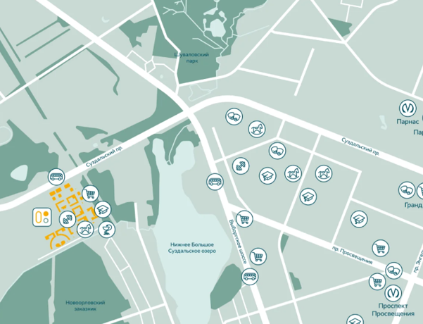 Совсем рядом расположены: Суздальские озера и Шуваловский парк, а в 10 минутах езды — Юнтоловский заповедник. Здесь часто гостил А. Пушкин, работал над своими пейзажами И. Шишкин, любил гулять А. Блок.